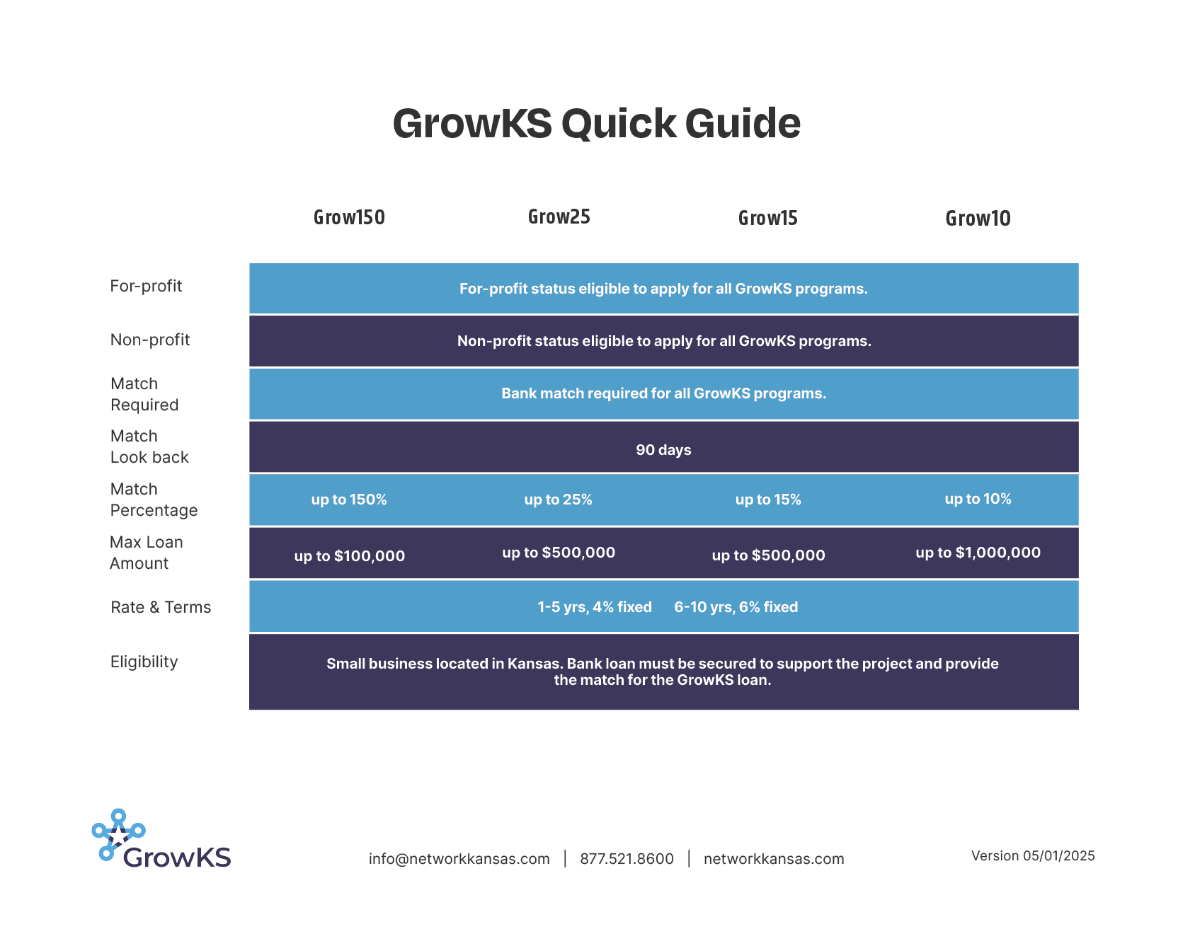 - GrowKS Loan Fund and GrowKS Equity programs will provide loans and equity investments that match private capital investment.
