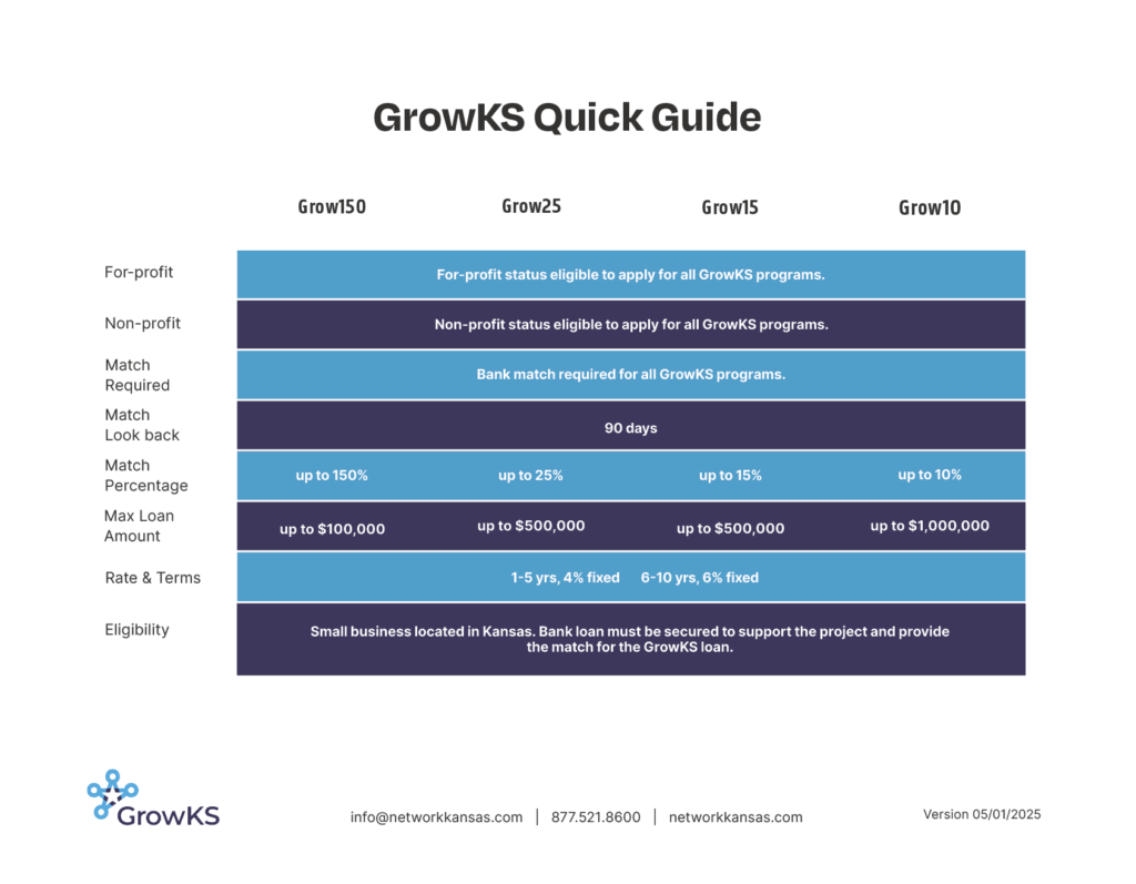 A bank or other financial institution is required to be part of the project, and the funding sources should occur around the same time. GrowKS is for businesses seeking additional funds for startup and/or working capital, franchise fees, equipment, investor, purchase, construction, etc.